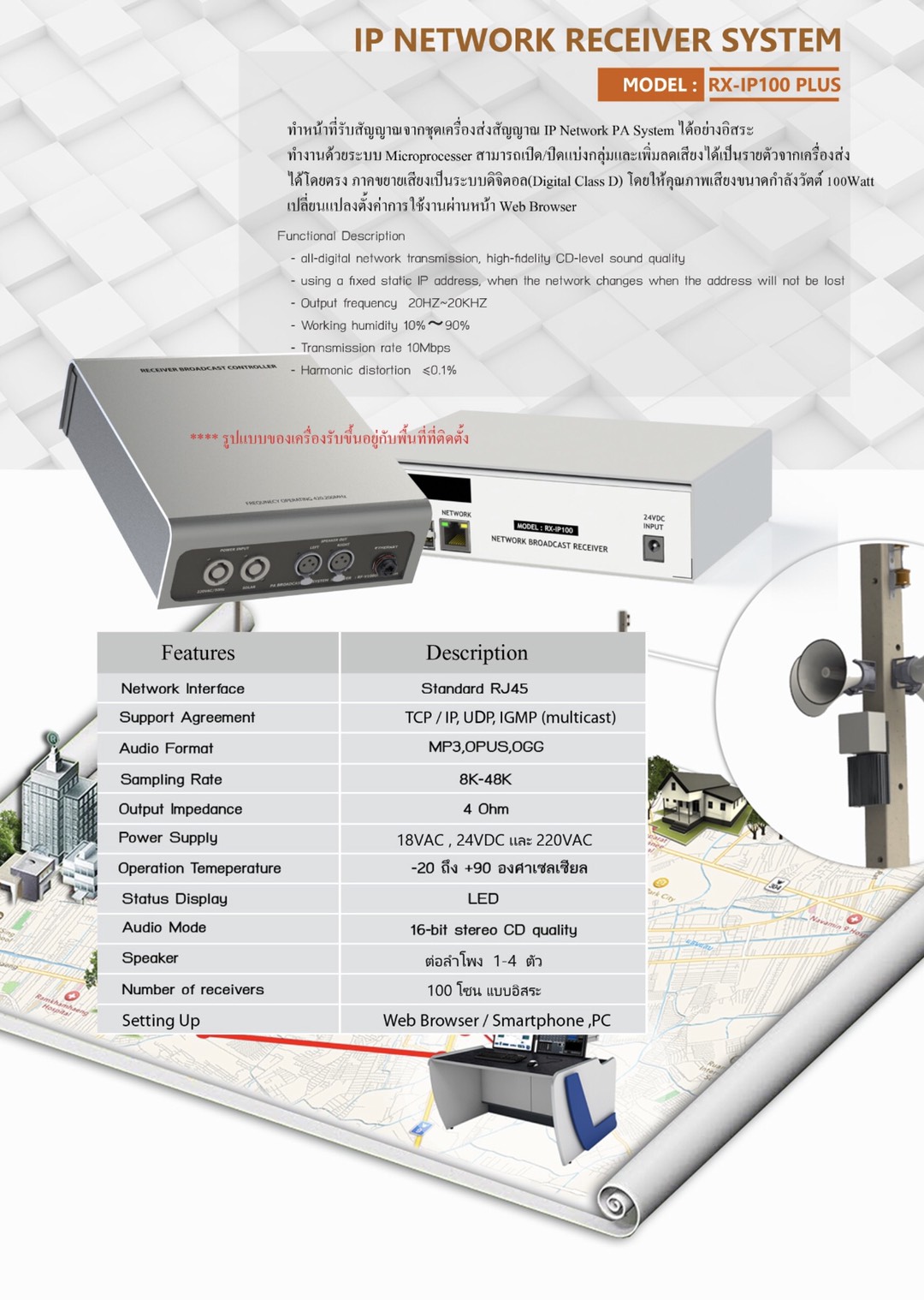 ระบบเสียงผ่านระบบไอพี เครื่องรับสัญญาณเครือข่ายไอพี ระบบประกาศเสียงตามสาย IP Network Broadcasting system WireLess PA เราสามารถปรับเปลี่ยนระบบเน็ตเวิร์คของเราเป็นระบบกระจายเสียงไร้สายได้ ระบบประกาศผ่านระบบเครือข่ายเน็ตเวิร์ค ส่งสัญญาณเสียงฝ่านระบบไอพีเน็ตเวิร์ค ซึ่งสามารถต่อระบบเพื่อกระจายเสียงแบบระบบกระจายเสียงไร้สายได้ ระบบเสียงตามสายดิจิตอลผ่านเครื่องรับส่ง ชุดเชื่อมต่อไร้สายระยะไกล